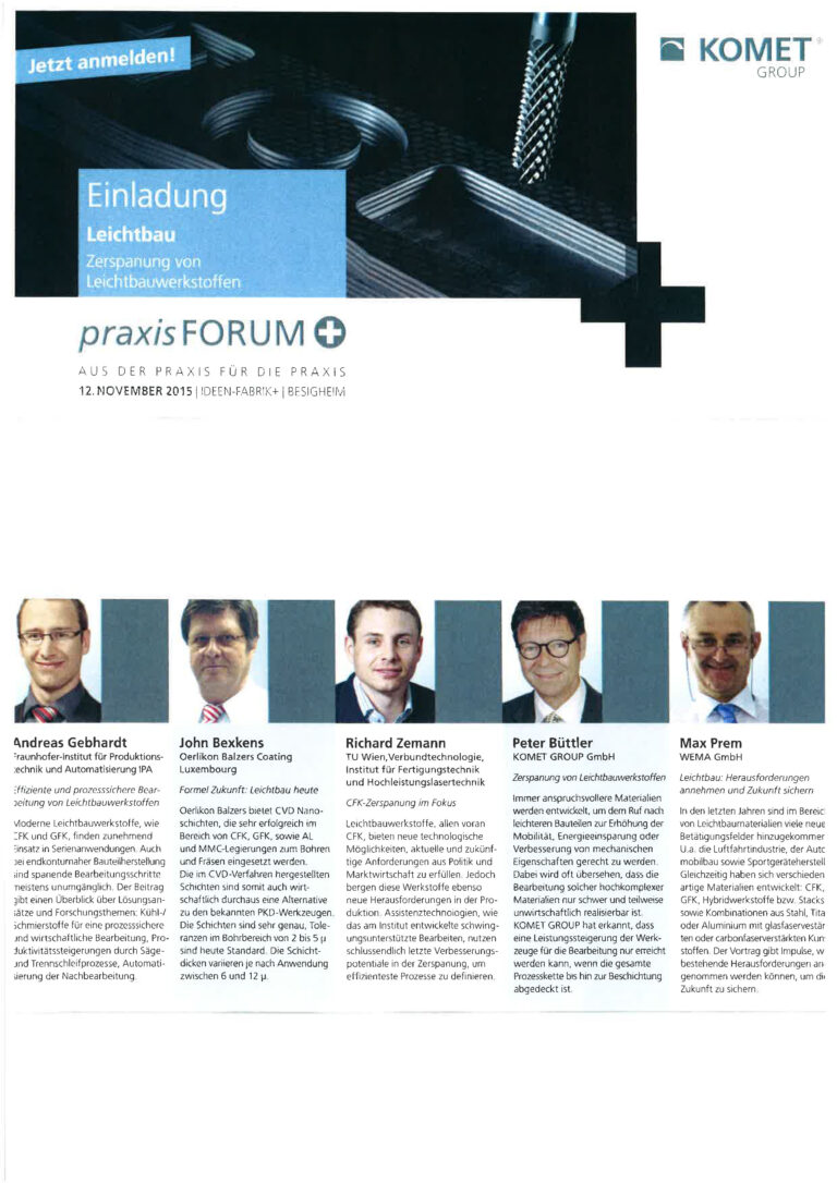 Herr Prem hat beim praxisFORUM+ der Komet Group GmbH in Besigheim am 12.11.2015 einen Vortrag zum Thema „Leichtbau: Herausforderungen annehmen und Zukunft sichern“ gehalten. Dieses Thema ist zur Zeit in aller Munde, da durch eine leichtere Bauweise z.B. Energiekosten eingespart werden können und dies besonders für die Luftfahrt- und Automobilindustrie von Interesse ist. Durch eine leichtere Bauweise sind jedoch neue Herausforderungen vorprogrammiert, die es anzunehmen gilt, um auch in Zukunft wettbewerbsfähig zu bleiben.